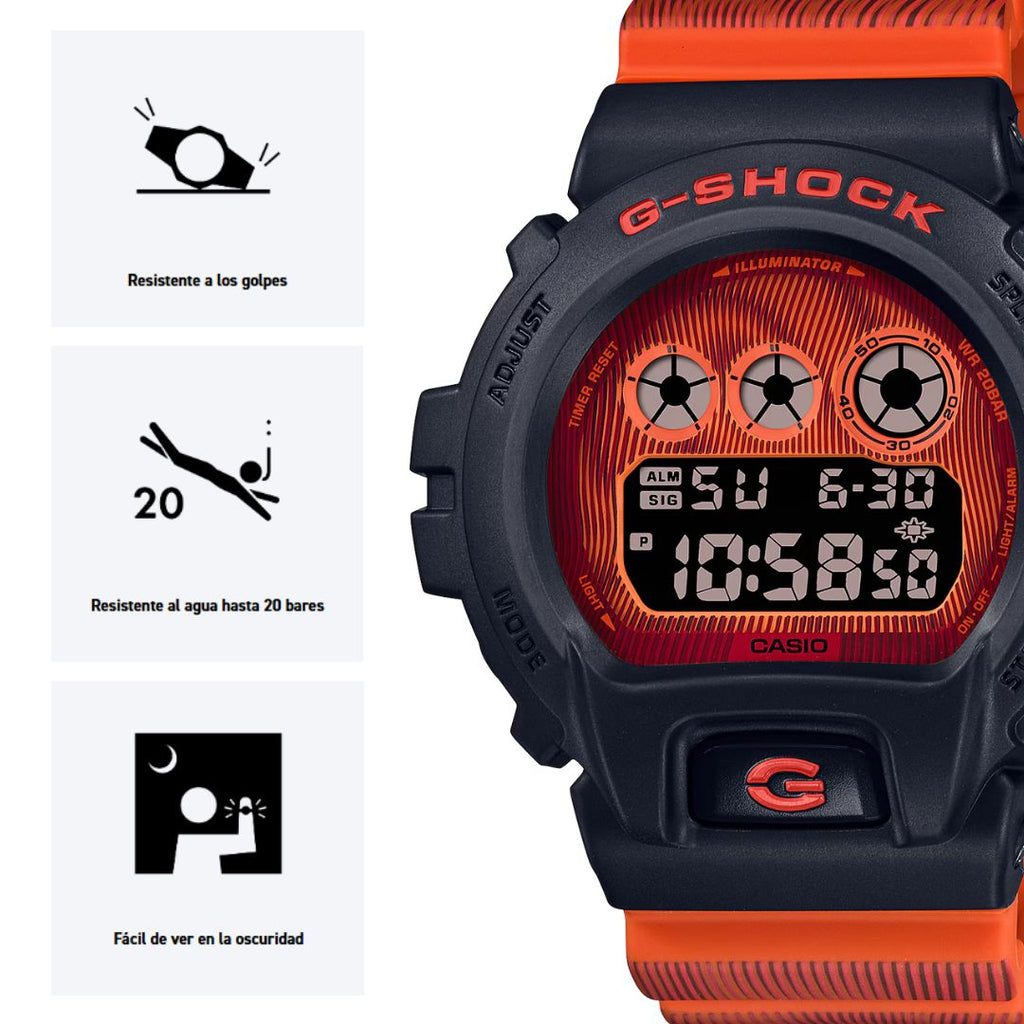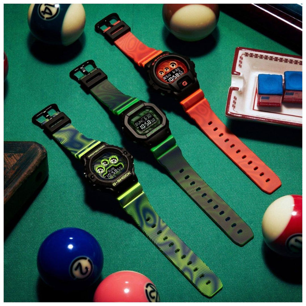 Salte a un túnel del tiempo. Los relojes Time Distortion causan un impacto tan poderoso como el propio G-SHOCK. La correa y el dial están impresos con patrones que distorsionan lúdicamente el tiempo y el espacio en brillantes colores fluorescentes que lo transportan al mundo de la ciencia ficción. Puede elegir entre el icónico DW-D5600 digital, el DW-5900 con su diseño de gráfico triple o el DW-6900 con su distintivo diseño de botón frontal.