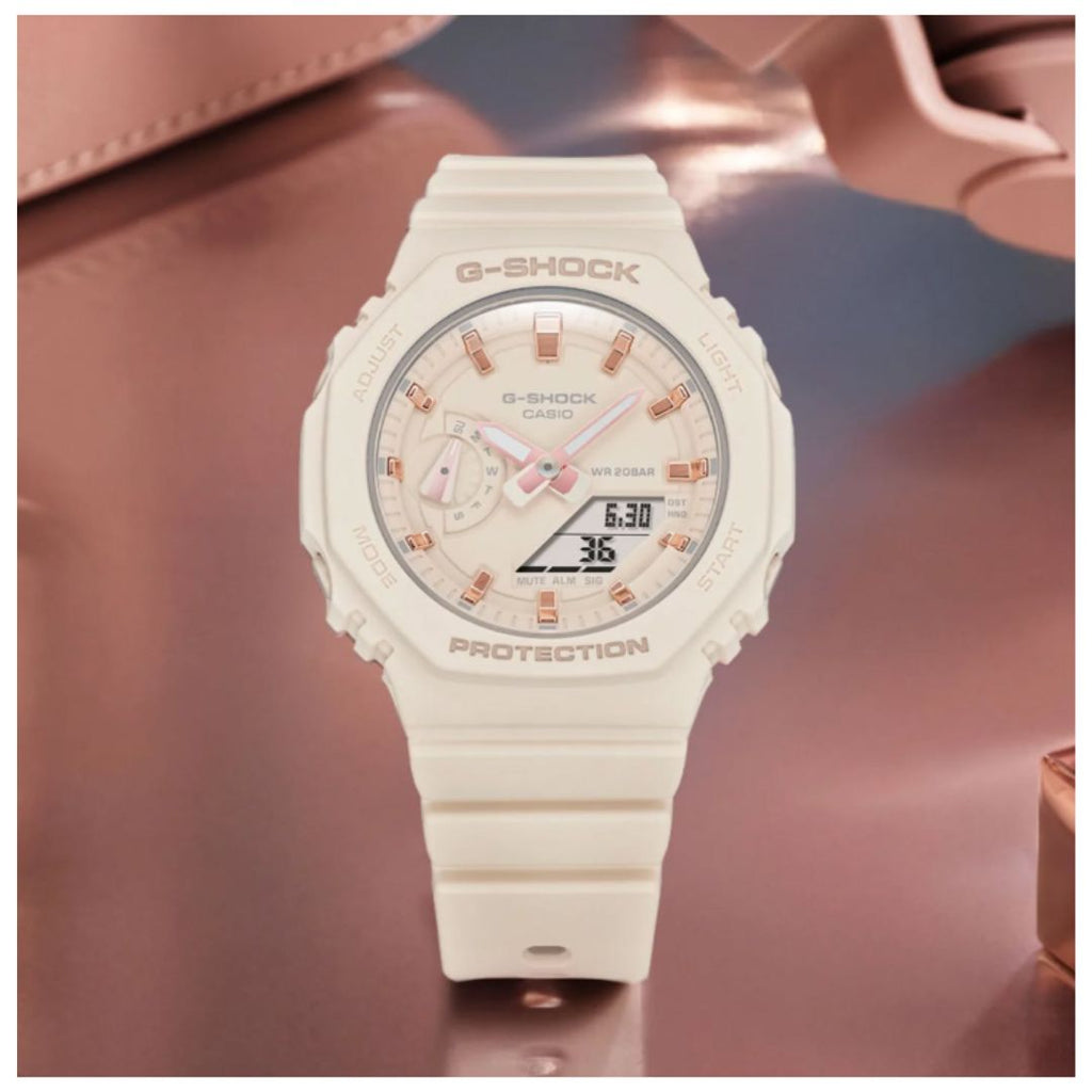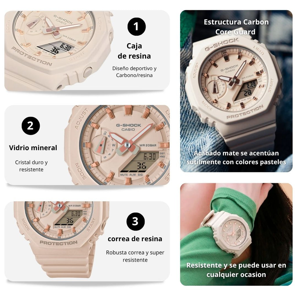 Esta serie reduce el tamaño de los relojes GA-2100 para crear un diseño sencillo y compacto. El bisel octogonal, la esfera plana, los marcadores de hora de barra sencillos y la estructura Carbon Core Guard que son características distintivas de la GA-2100 están ahora disponibles en una configuración compacta.