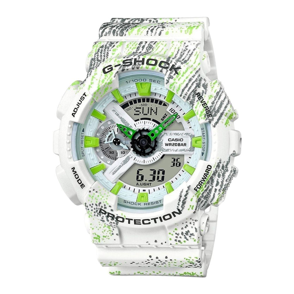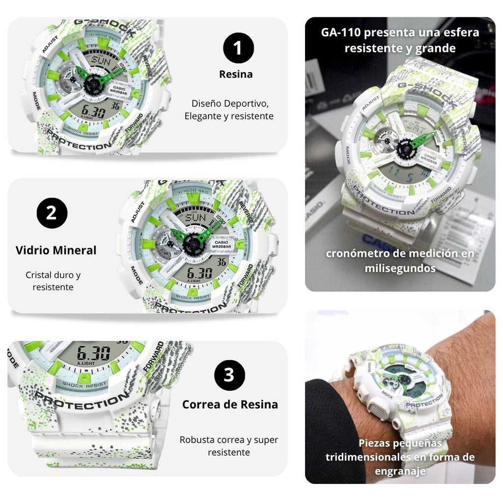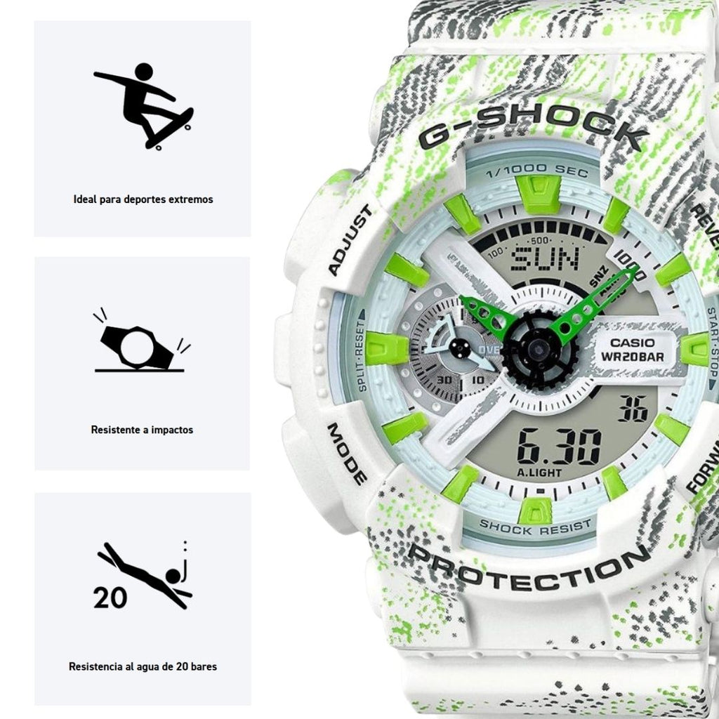 Los modelos G-Shock incluyen el GA-110TX-1A (negro), el GA-110TX-2A (azul) y el GA-110TX-7A (blanco). Estos relojes ofrecen resistencia a golpes, resistencia al agua hasta 200 metros, hora mundial, cronómetro, temporizador, 5 alarmas (una con función de repetición) y luz LED automática.