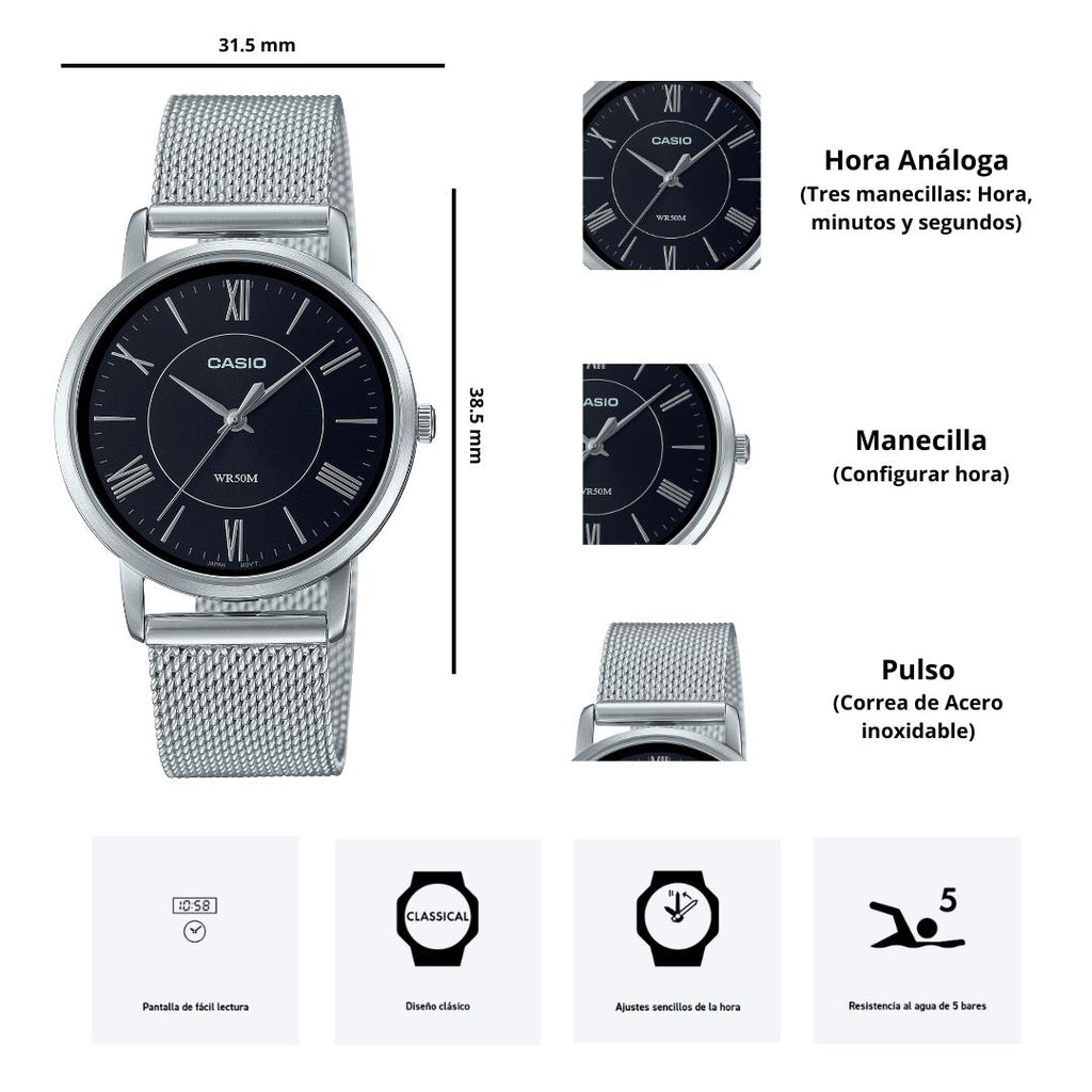 Relojes clásicos de Casio: la épica línea analógica ahora presenta un diseño aún más delgado para proporcionar una comodidad sofisticada. Los clásicos indicadores con números romanos fáciles de visualizar intensifican la atractiva y simple esfera del reloj para proporcionar un diseño que muestra claramente la hora del día.