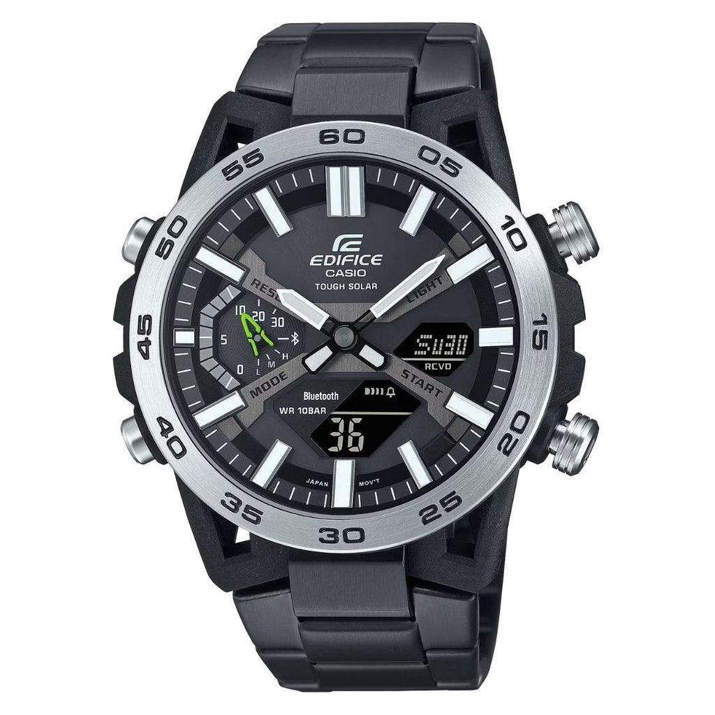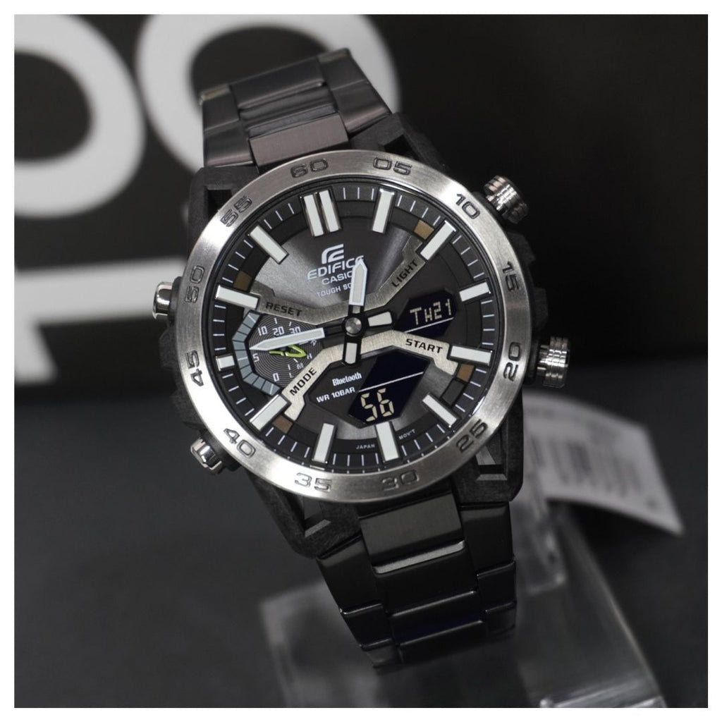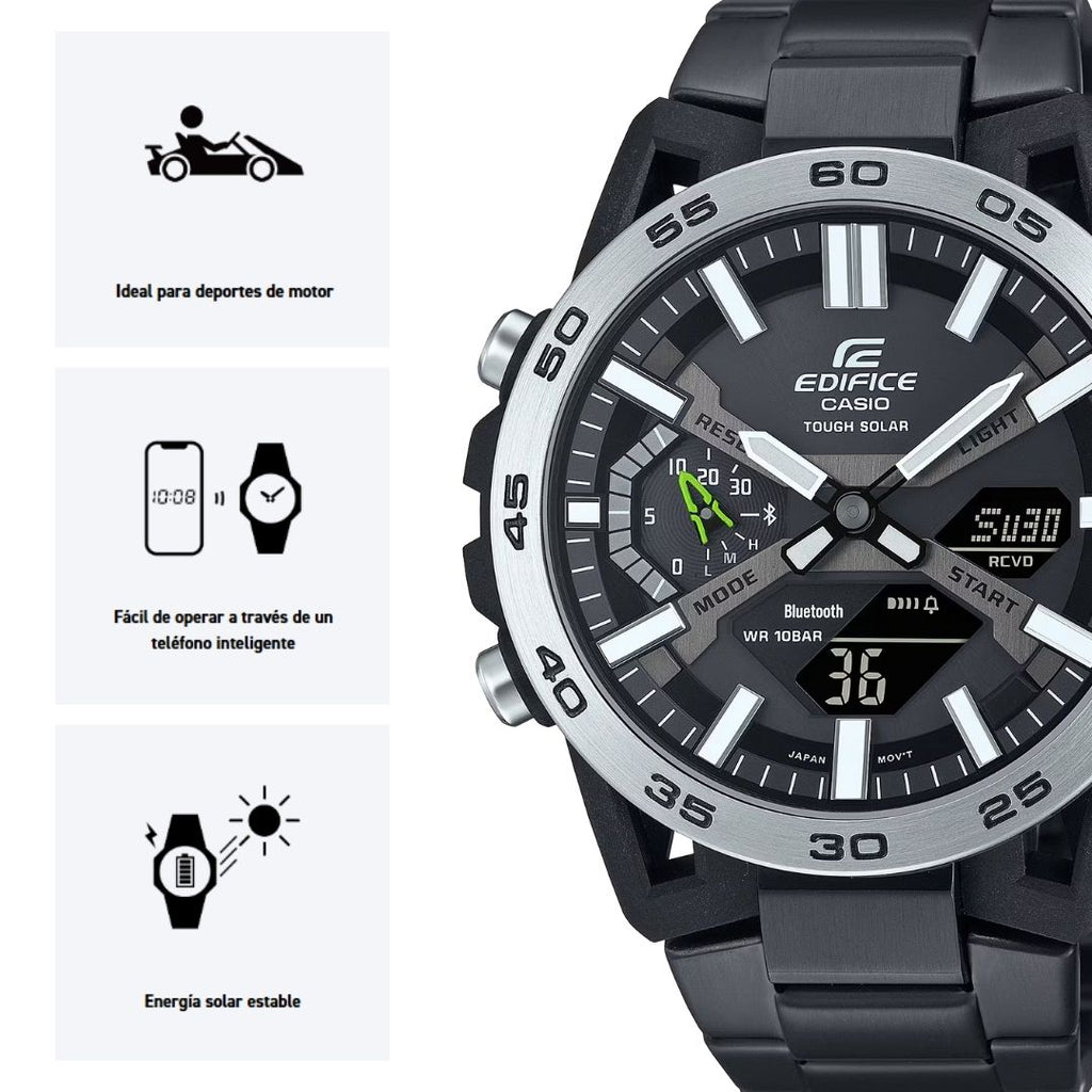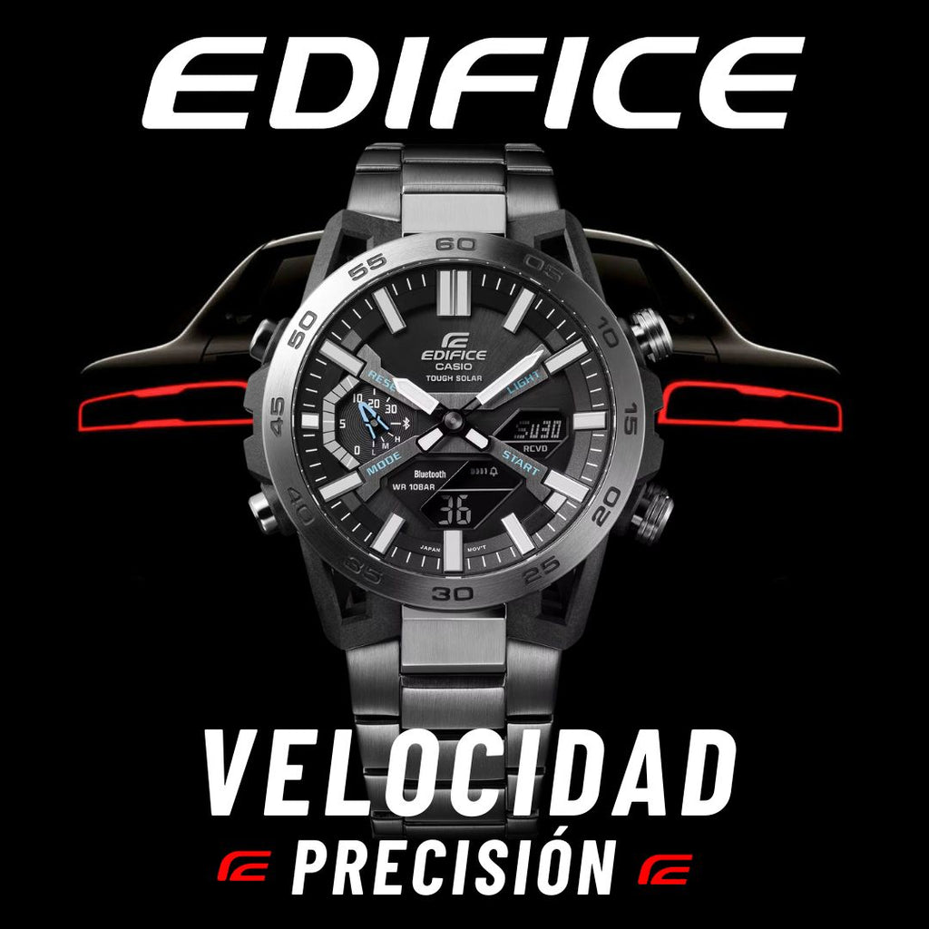 Toma el control de la velocidad y la inteligencia con la combinación analógica-digital del EDIFICE solar. Inspirado en la suspensión de los coches de fórmula 1, el SOSPENSIONE ECB-2000 es el primer EDIFICE dotado de una caja de resina reforzada con fibra de carbono, con un diseño de caja único que distribuye las orejetas, la unión entre la caja y la correa, en una composición de cuatro ejes reforzadas con fibra de carbono, otorgando el verdadero espíritu de los deportes de motor tanto al diseño como a los materiales de este reloj.