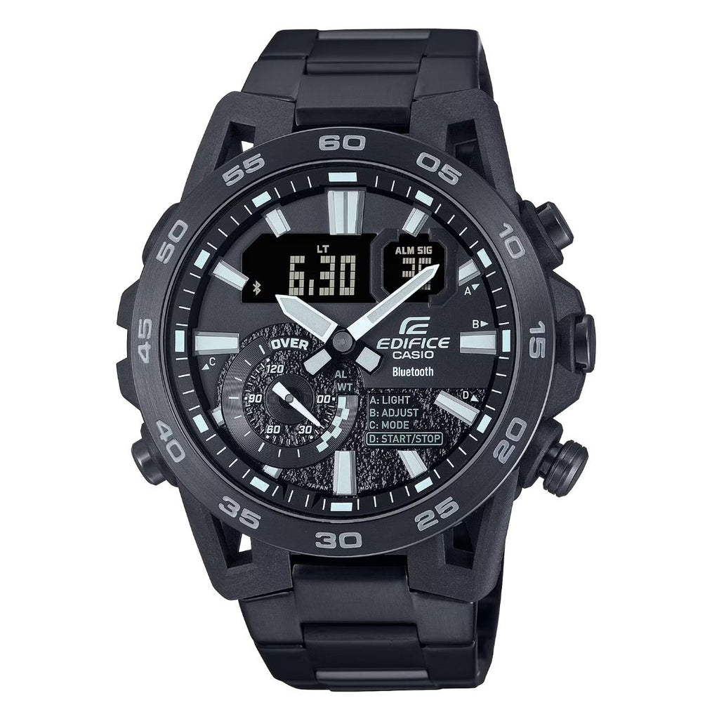 Presentamos la forma, funcionalidad y sofisticación propias del automovilismo: el EDIFICE SOSPENSIONE ECB-40, con un diseño de brazo de suspensión de resina reforzada con fibra de carbono y Smartphone Link. El diseño único de la caja se inspira en la suspensión de los coches de fórmula, con asas configuradas en una disposición de cuatro brazos, dos arriba y dos abajo.