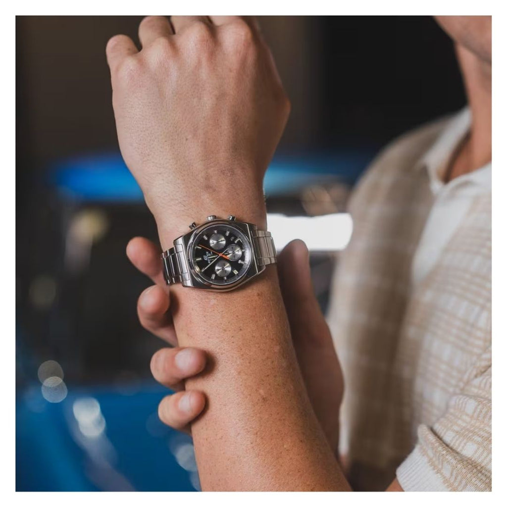 El diámetro más pequeño de la carcasa presenta un aspecto elegante de pura velocidad. Con cristal de zafiro, carcasa de acero inoxidable y correa sólida de acero inoxidable, este reloj tiene una resistencia al agua de hasta 10 bares. Este cronógrafo deportivo y clásico lo llevará de los entornos informales a las reuniones de negocios al instante.