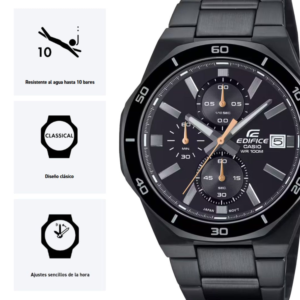 Luce un clásico con un toque de color y disfruta de la sofisticación de un cronógrafo deportivo con resistencia al agua de 10 bares. La superficie frontal plana del bisel octogonal está pulida con un acabado fino y se combina con los laterales con acabado de espejo, creando un elegante contraste de texturas. La caja y la correa negras con baño de iones, acentuadas con un toque de color en el segundero, proyectan la esencia del estilo deportivo EDIFICE.