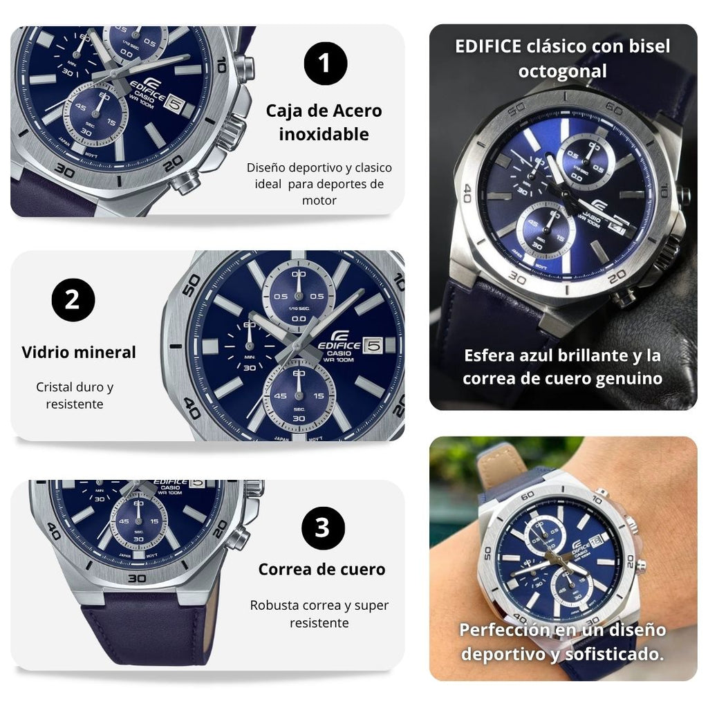 Atrévete a destacar con el Casio Edifice EFV-640L-2A, un reloj que fusiona dinamismo y elegancia en cada detalle. Su esfera azul brillante y correa de cuero genuino proyectan un estilo cómodo y moderno, mientras que el marco octogonal y la carcasa de acero inoxidable reflejan solidez y carácter.