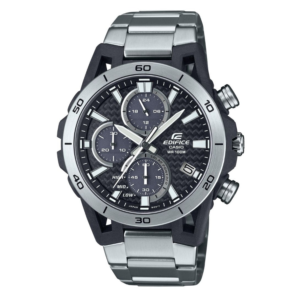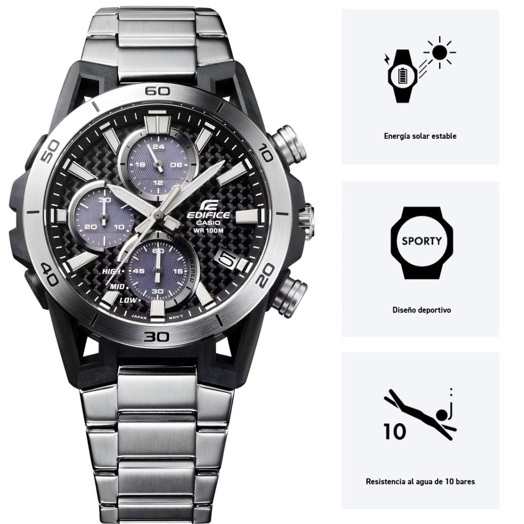 La caja de resina reforzada con fibra de carbono es liviana, pero resistente, y emplea un diseño de asas inspirado en la suspensión de doble horquilla de cuatro brazos de los autos de fórmula. El diámetro más pequeño de la caja permite un ajuste fácil y cómodo. Este es un reloj que encarna la velocidad e inteligencia de la línea EDIFICE con una combinación sofisticada de materiales, diseño y funcionalidad.