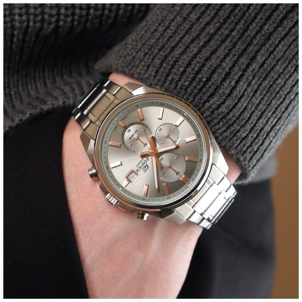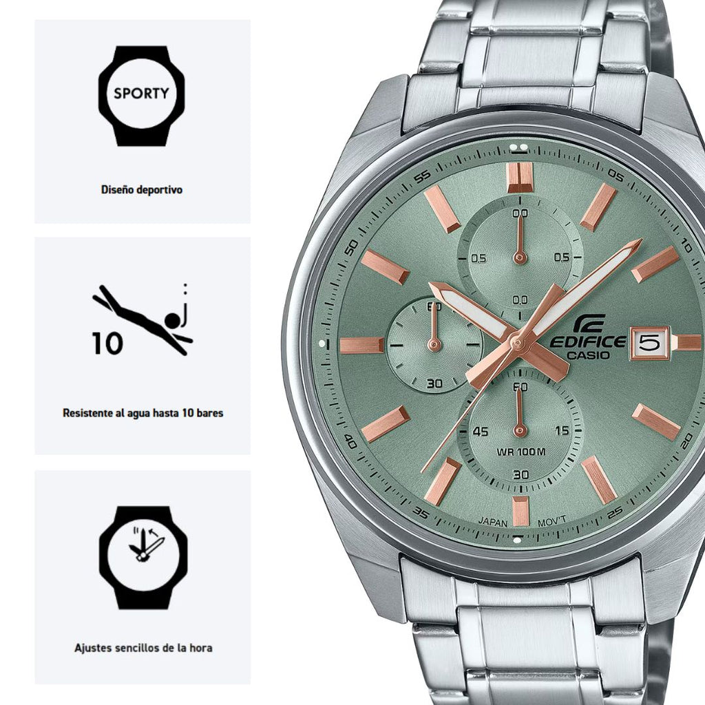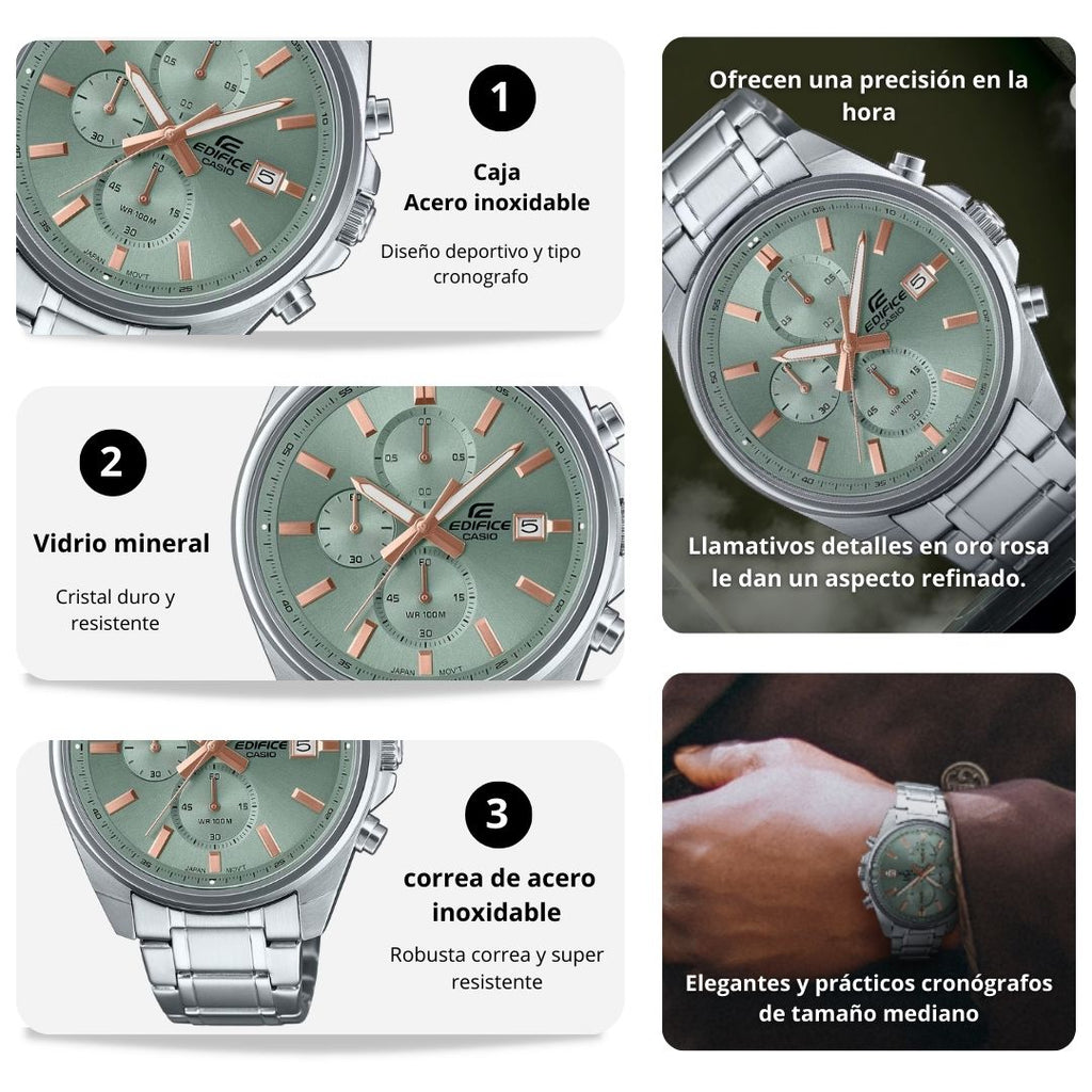 Realza tu estilo con un cronógrafo EDIFICE moderno, deportivo y de tamaño mediano. El fino bisel enmarca una esfera más ancha, lo que garantiza una lectura fácil, y los llamativos detalles en oro rosa le dan un aspecto refinado. Más que una belleza sofisticada, estos relojes también ofrecen una precisión en la hora.
