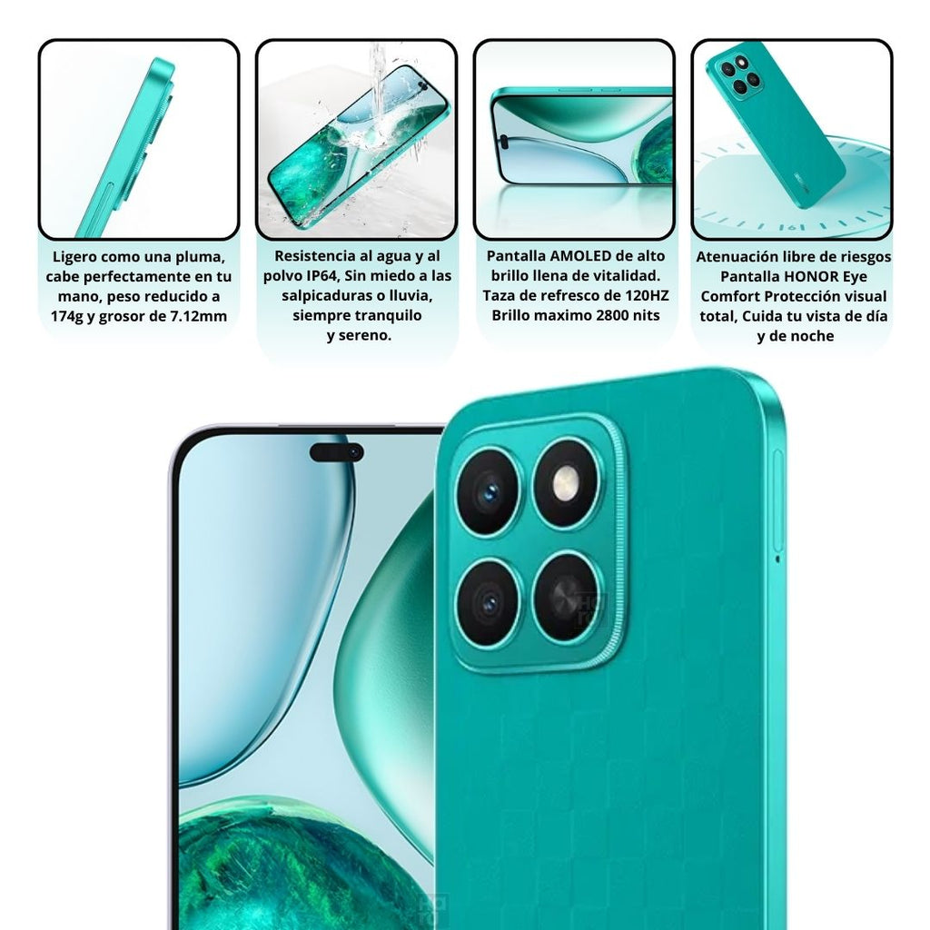 Clasificación de resistencia al agua y al polvo IP64. Sin miedo a las salpicaduras o lluvia, siempre tranquilo y sereno. Resistente a caidas de 1.8m y proteccion 360°. Pantalla AMOLED de gran brillo, 2800 nits (brillo maximo), con taza de refrezco de 120Hz. Batería de larga duración 5000Mah, diversión siempre activa.Con el Modo de Súper Ahorro de Energía de HONOR.
