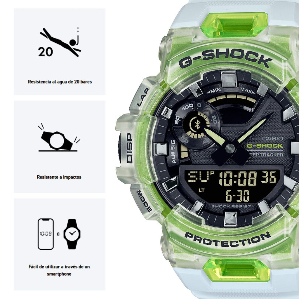 Agregue una explosión de vitalidad a sus entrenamientos con uno de estos relojes G-SHOCK deportivos de colores brillantes de G-SQUAD. Los detalles en verde, naranja y púrpura intensos de la moda deportiva actual acentúan el marco translúcido para llevar su estilo deportivo al siguiente nivel.