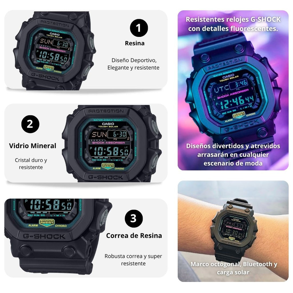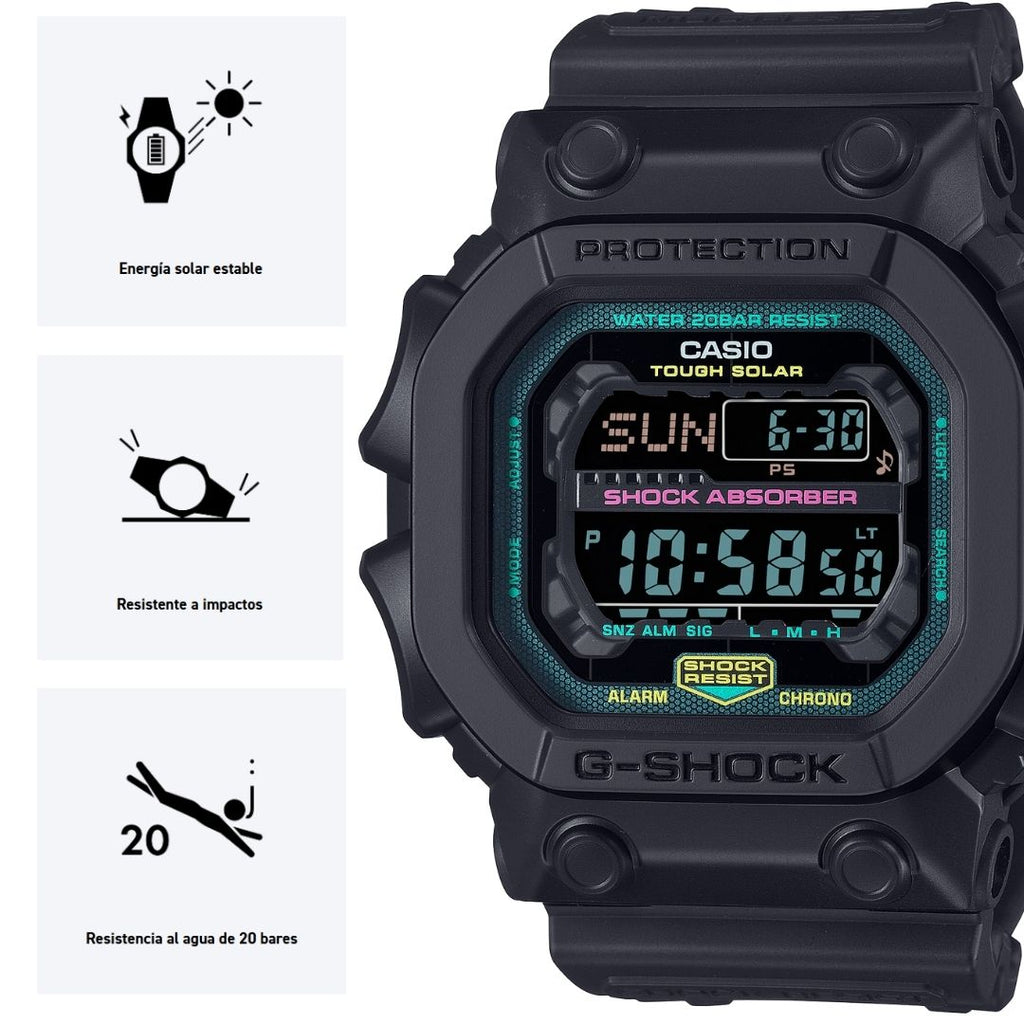 El negro audaz se combina con el color brillante en estos resistentes relojes G-SHOCK con detalles fluorescentes. El marco negro mate y la correa contrastan con elegancia, con toques de azul vivo, rosa y amarillo en las manecillas, los marcadores de hora y las marcas del dial, transportándolo a un mundo virtual.