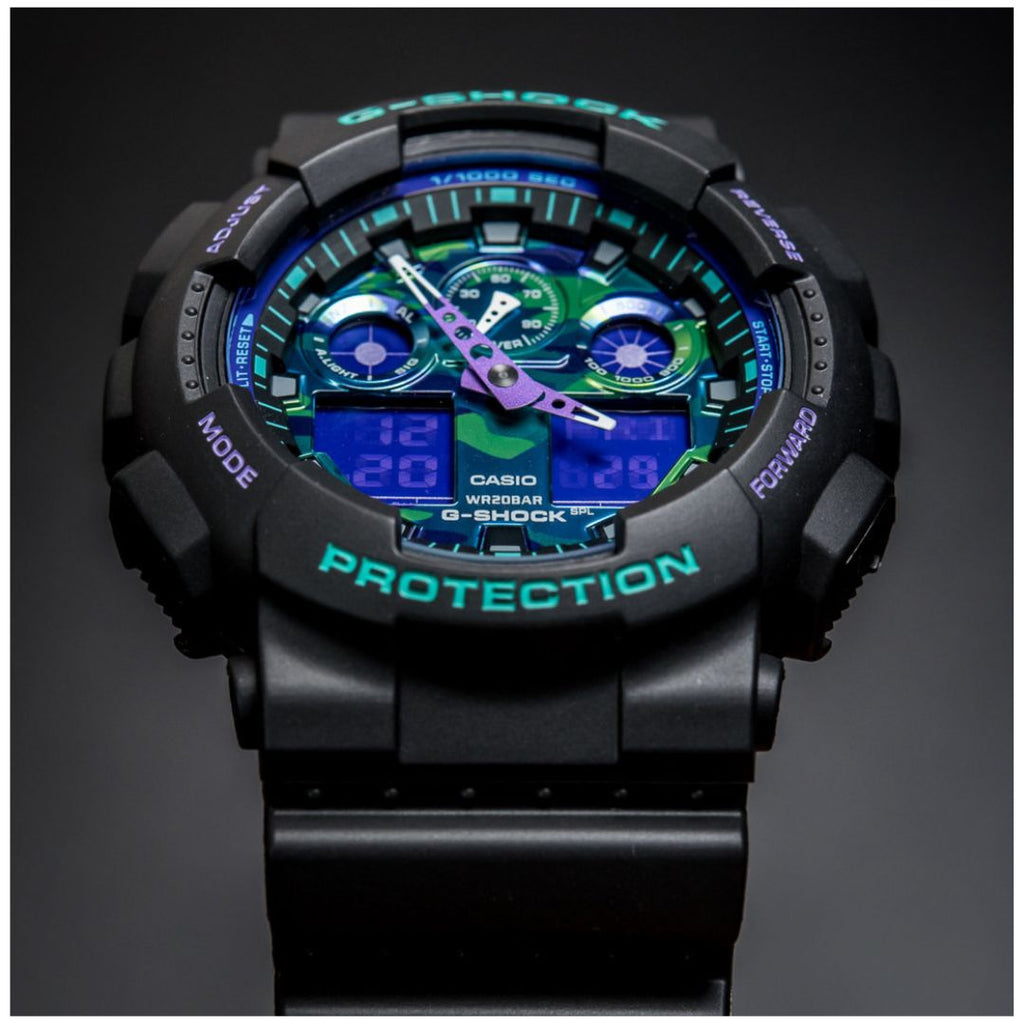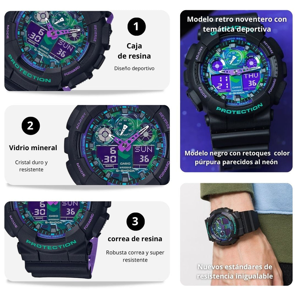 El color negro básico de este modelo se retocó con detalles en color púrpura parecidos al neón en el marco y la esfera para que se vea simple. El modelo base de esta gama es el GA-100 con cuatro áreas con pantallas digitales y manecillas grandes y ligeras de aluminio altamente duradero. Las correas moldeadas tienen dos colores: negro en el exterior y púrpura en el interior.