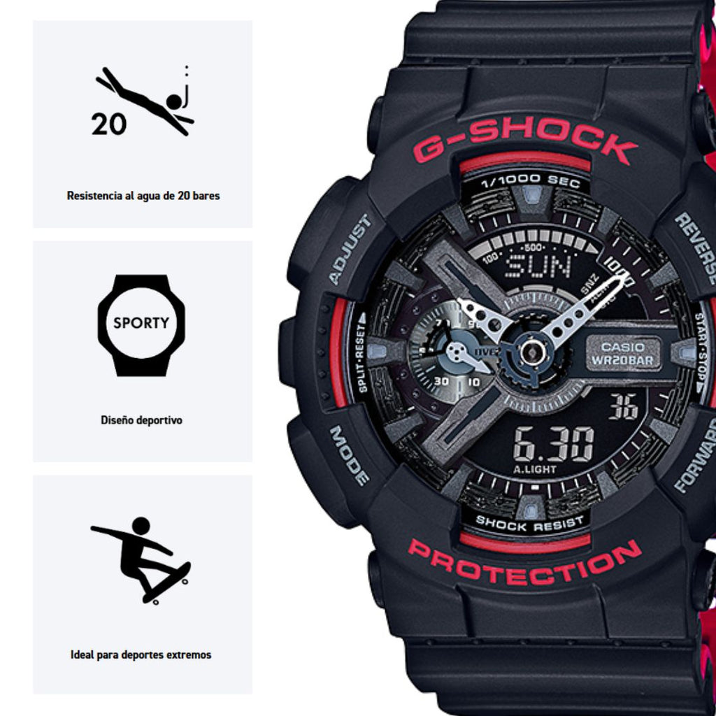 De G-SHOCK, sinónimo de resistencia, llega la Serie Negro y Rojo, que aprovecha al máximo los colores característicos de G-SHOCK. Los colores de la marca se utilizan tanto en la caja como en la correa. El color base del reloj es negro, para una apariencia robusta y sin artificios, con toques de rojo en las letras y otros componentes de la caja.