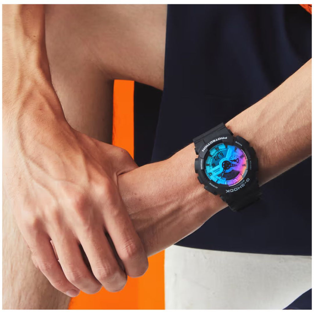 Sumérjase en un luminoso color iridiscente, el primer G-SHOCK con un acabado de cristal gradado en toda la superficie que evoca el reflejo de la luz solar. La deposición de vapor de arcoíris reproduce el cielo de verano al atardecer, y cambia de tono según el momento dependiendo de la luz.