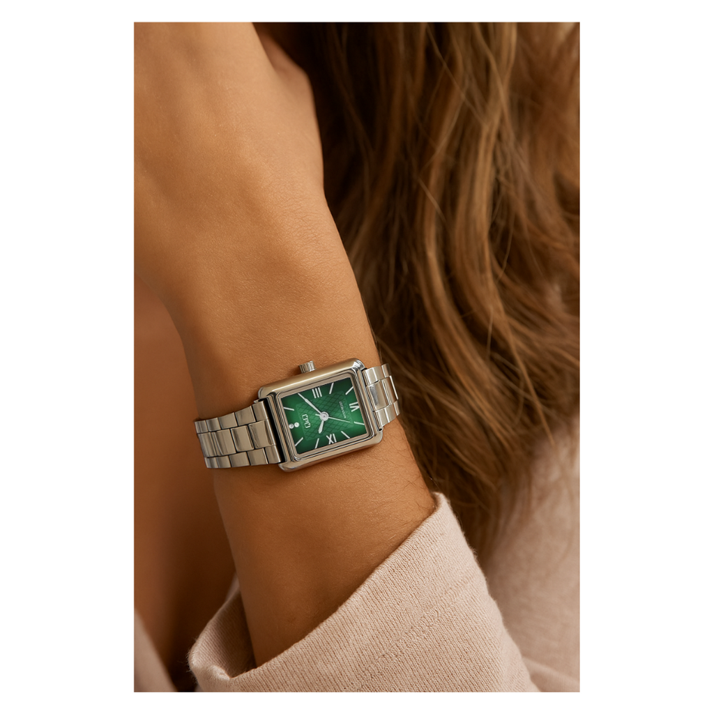 Su caja y correa son de acero inoxidable de acabado pulido, aportando resistencia, durabilidad y un toque brillante y moderno. El diámetro de la caja es de 22 mm, lo que lo hace ideal para muñecas delicadas y resalta su corte femenino. El diseño de la carátula es elegante, con números romanos que le dan un aire clásico y refinado.