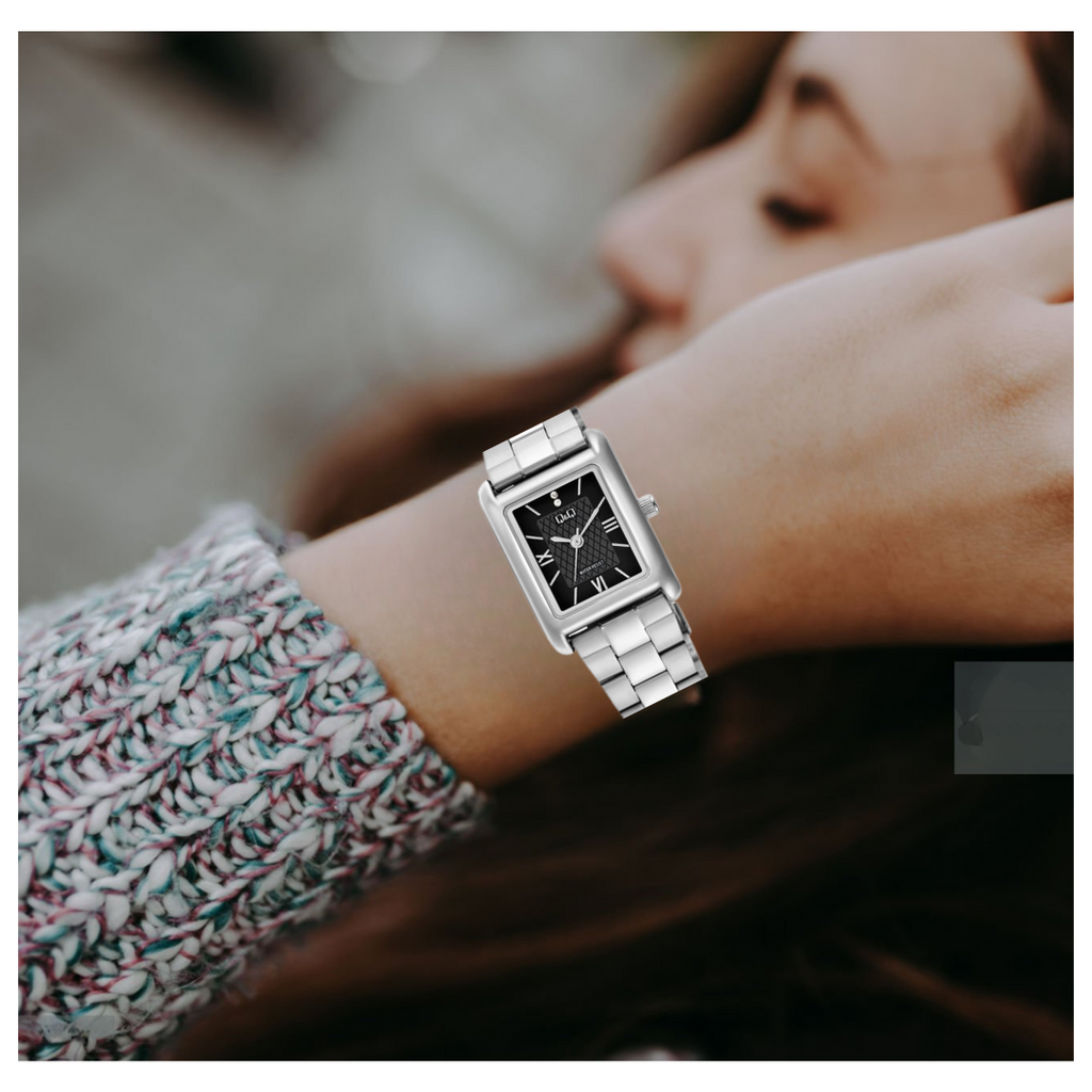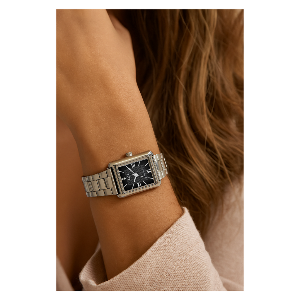 Diseñado para mujeres que aprecian la belleza en los detalles, este reloj combina a la perfección la sofisticación del acero inoxidable con un diseño atemporal. Su caja rectangular aporta un aire moderno y refinado, mientras que la carátula negra con delicado patrón geométrico y números romanos en tono plateado realza la elegancia en cada mirada.