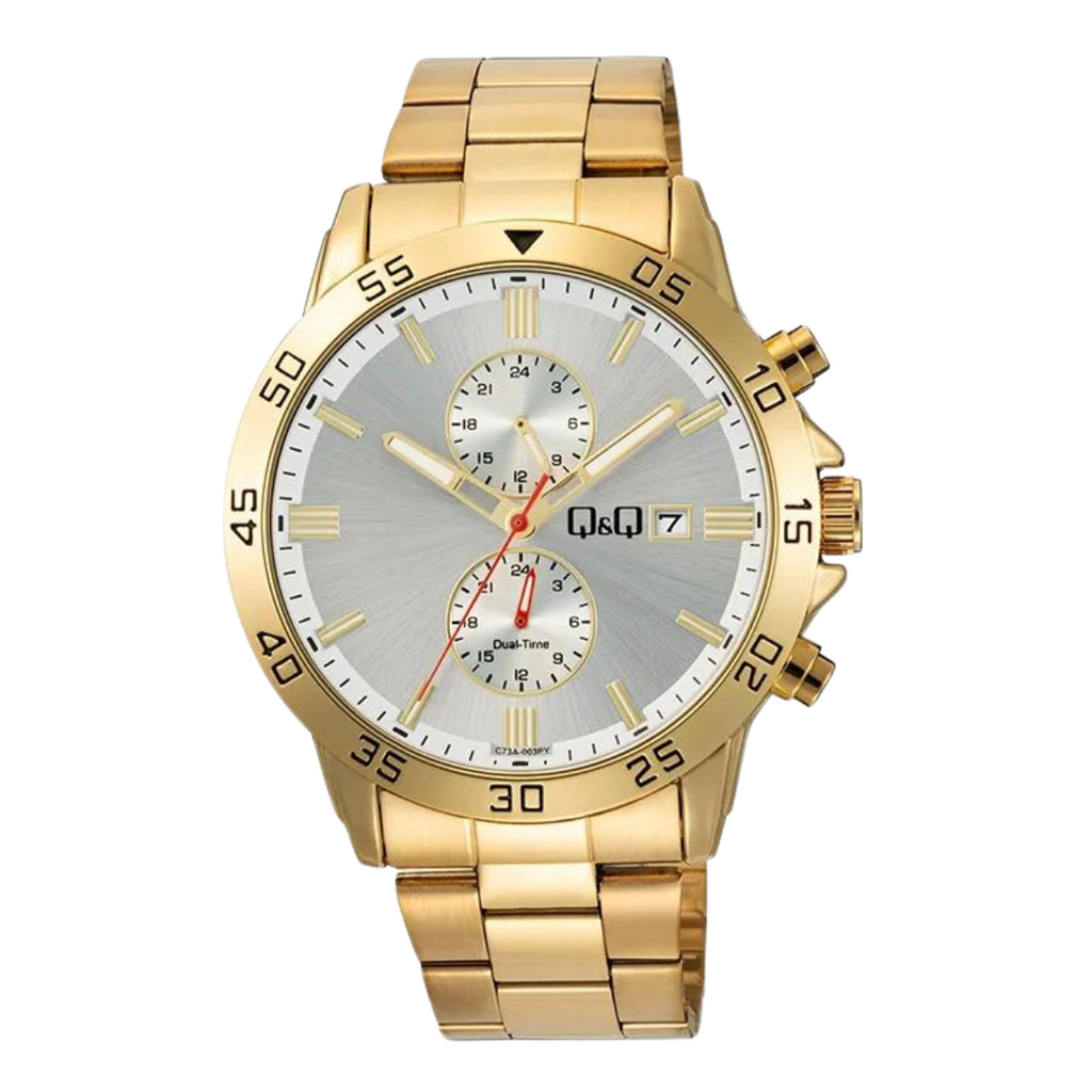 El Q&Q C73A-003PY es mucho más que un reloj: es una declaración de estilo. Con un diseño sofisticado en dorado y una carátula plateada con detalles en múltiples esferas, este modelo combina funcionalidad y distinción. Ideal para quienes buscan destacar con clase, cuenta con indicador de fecha.