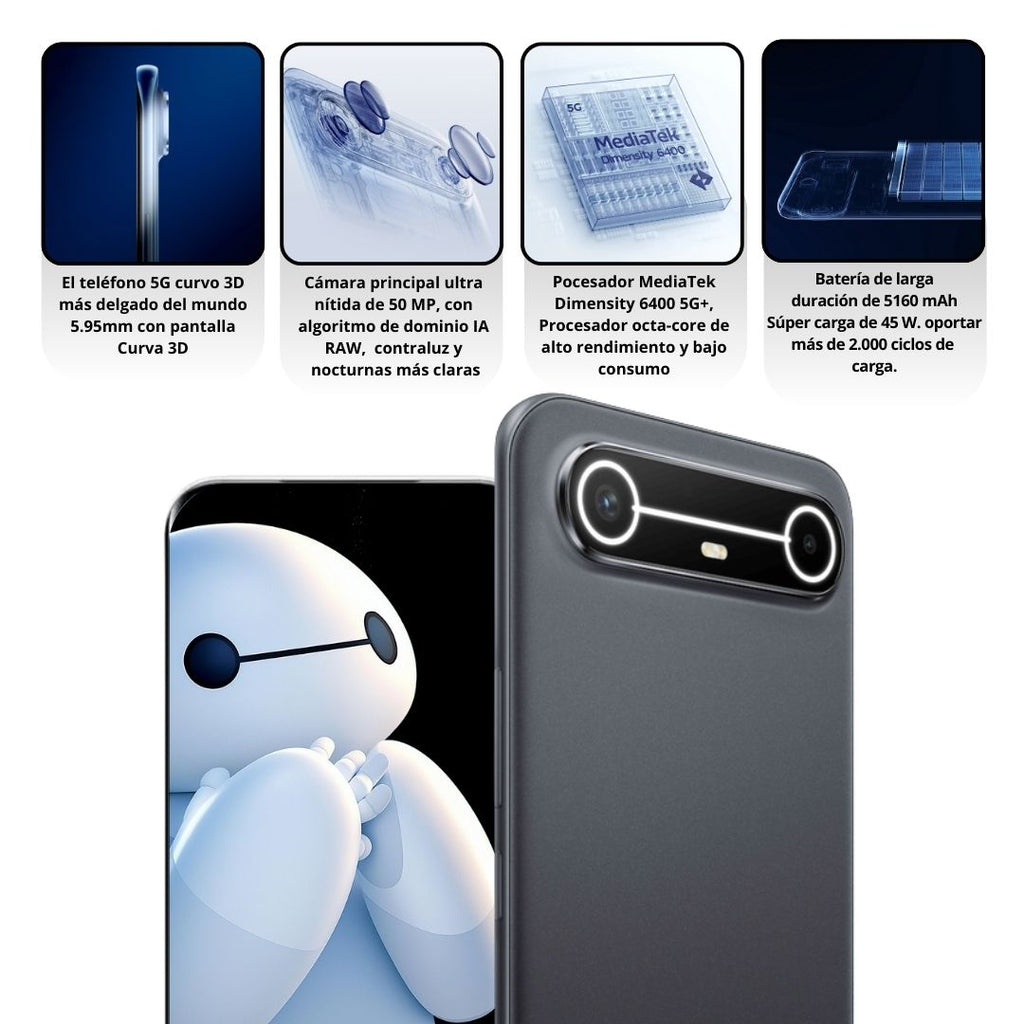 Batería de larga duración de 5160 mAh, súper carga de 45W, puede soportar más de 2.000 ciclos de carga, el sistema de carga por IA aprende sus hábitos. Manténgase siempre fresco, El cuerpo ultradelgado sigue utilizando la Cámara de vapor para disipar el calor. Pocesador MediaTek Dimensity 6400 5G+, doble velocidad de red. Su tecnología de agregación de portadoras permite combinaciones dúplex mixtas FDD + TDD.