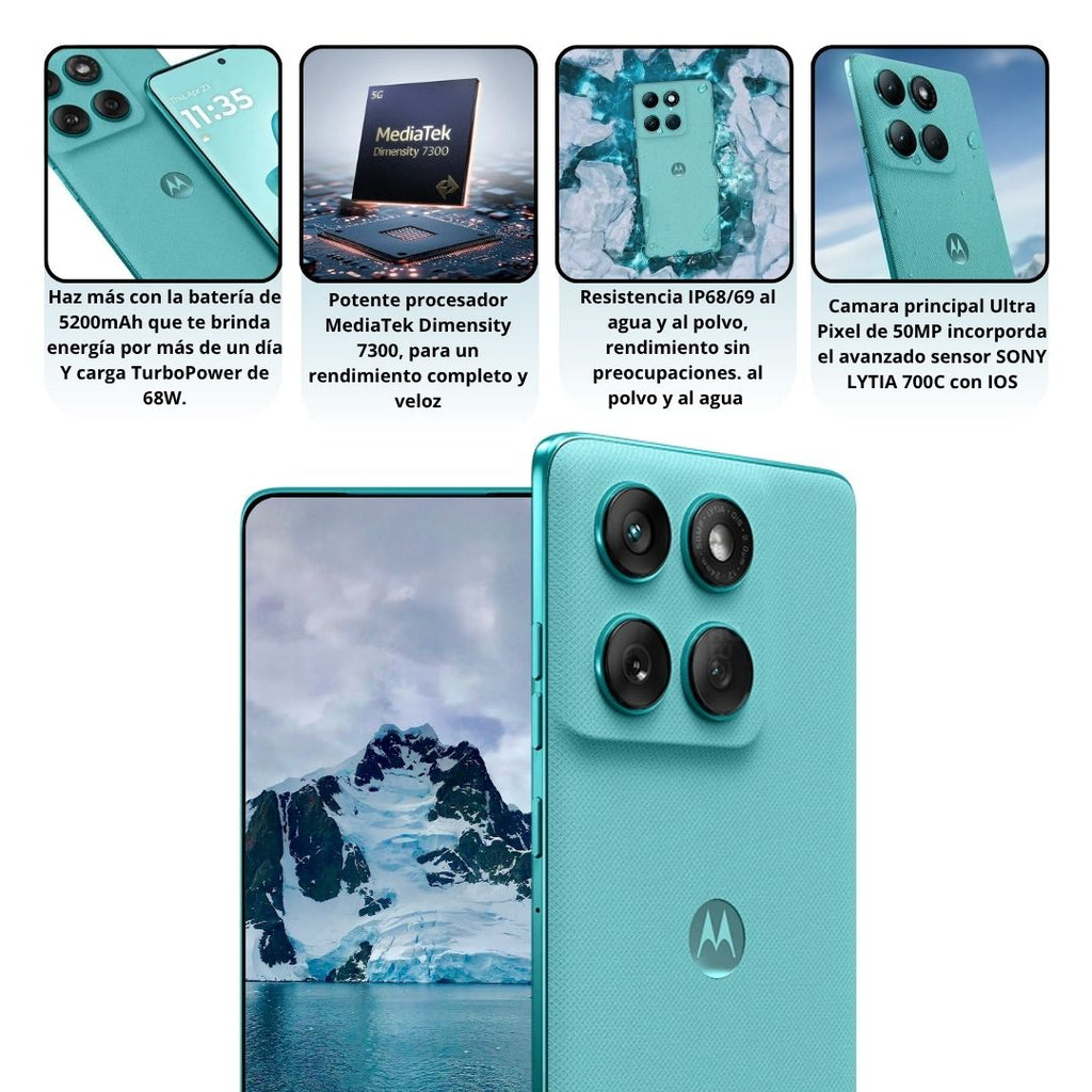 Disfrutá de un rendimiento sin interrupciones con el procesador MediaTek Dimensity 7300 y RAM Boost, que te da potencia extra cuando más la necesitas. Perfecto para entretenimiento agil y eficiente. Hacé más con la batería de 5200mAh que te brinda energía por más de un día, recargá en un instante con la impresionante velocidad de carga TurboPower de 68W. Camara principal Ultra Pixel de 50MP incorpora el avanzado sensor Sony LYTIA 700C con IOS garantizando imagenes nitidas y estables, captura cada detalle de cerca o de lejos disfruta de tomas expansivas con un campo de vision Ultra amplio de 120° acecate con macro vision.