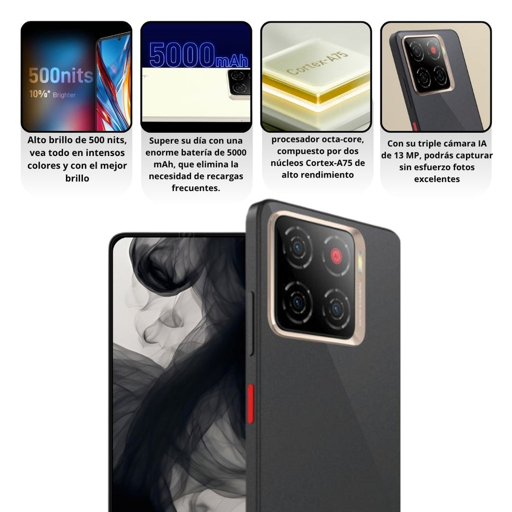 Pantalla grande HD+ de 6,75” y 90 Hz. Sumérjase en imágenes claras y vívidas con la amplia pantalla HD+ de 6,75”. Supere su día con una enorme batería de 5000 mAh, que elimina la necesidad de recargas frecuentes. El dispositivo está equipado con un robusto procesador octa-core, compuesto por dos núcleos Cortex-A75 de alto rendimiento, que ofrecen un rendimiento mejorado y una eficiencia energética mejorada. Disfrute de una experiencia fluida de 4.5G con velocidades de descarga mejoradas y rendimiento de transmisión en 4G.
