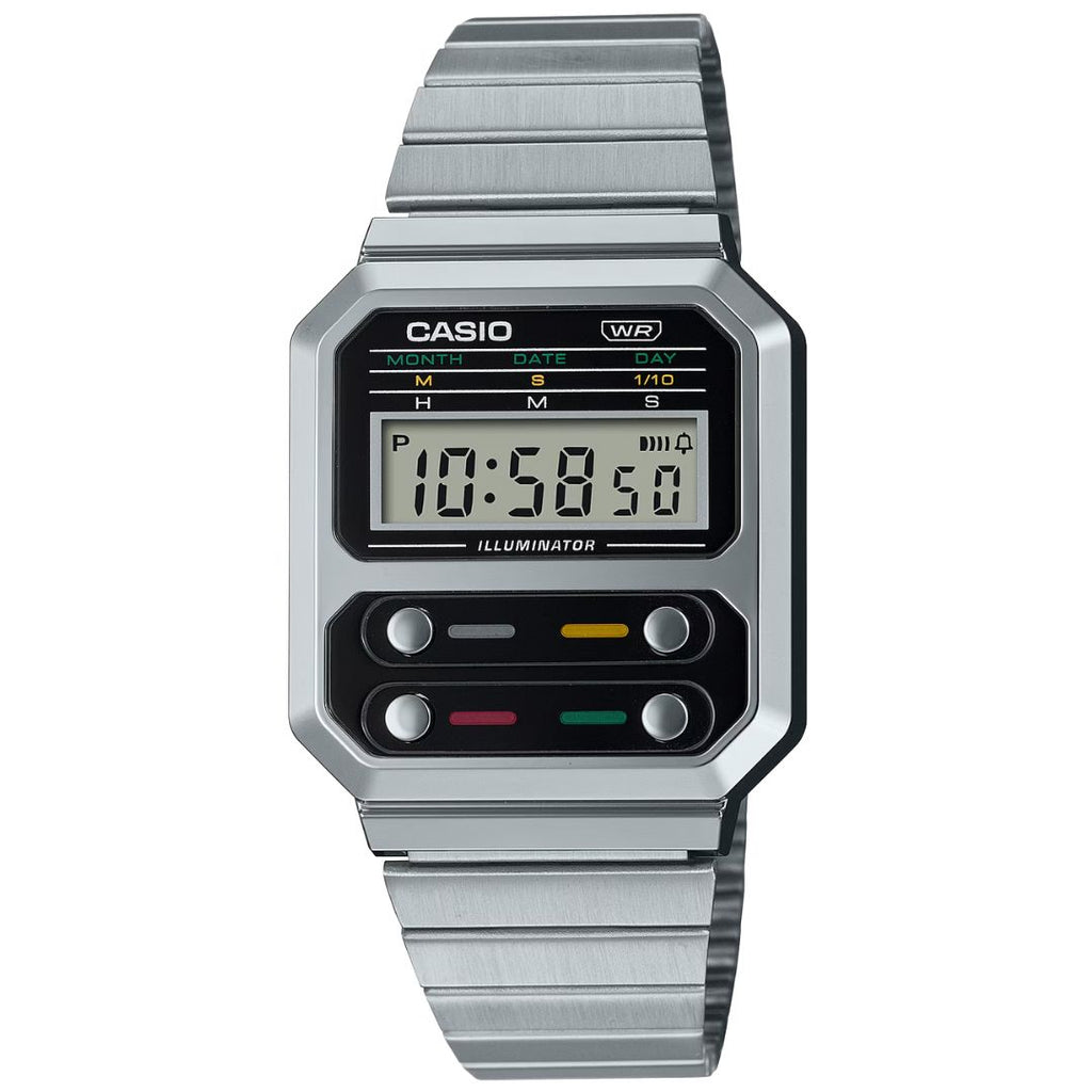Consienta a su yo interior apasionado por los dispositivos con este elegante reloj unisex directo de la colección Casio Vintage. La línea A100 rinde homenaje al F‐100, el primer reloj Casio diseñado con una carcasa de resina.