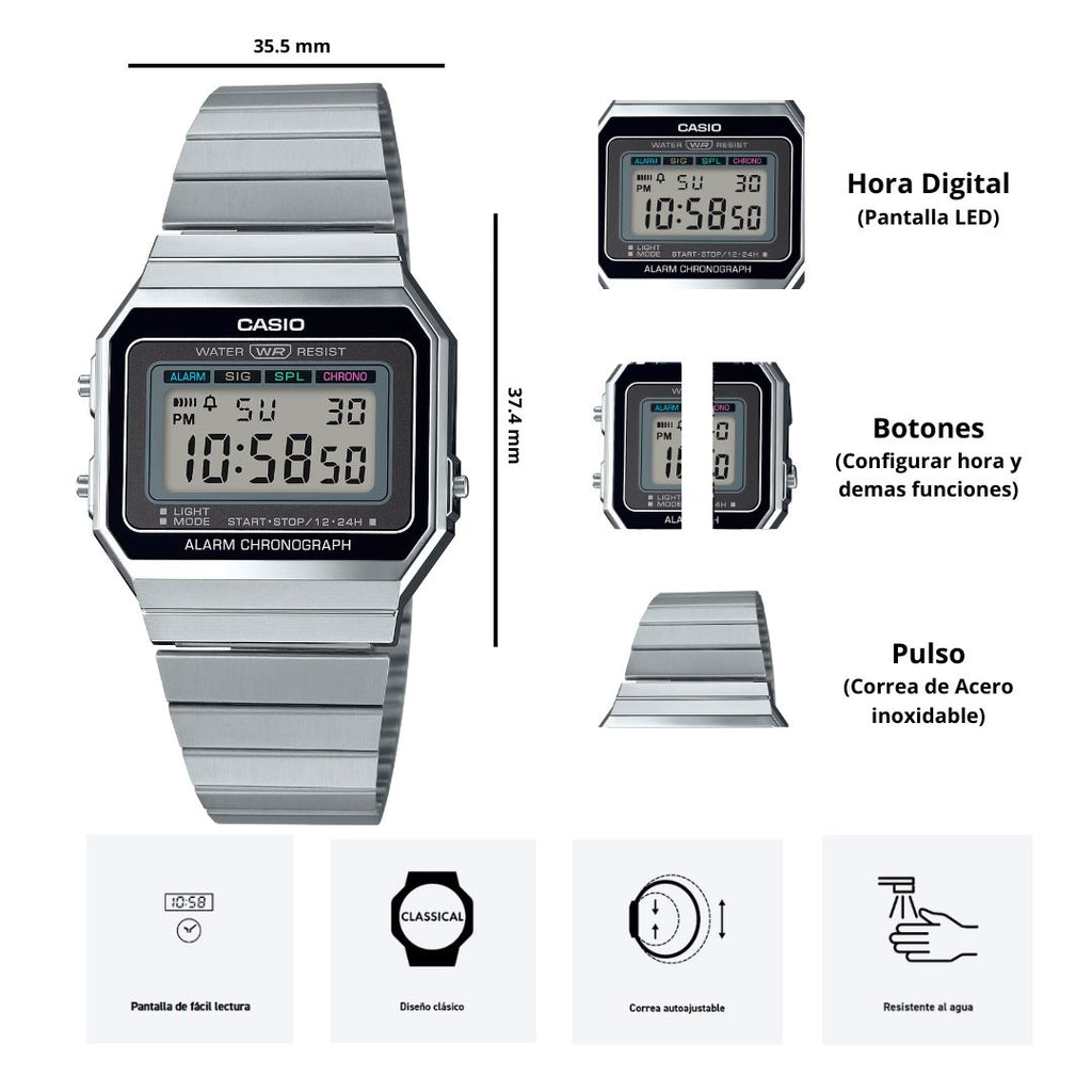- Funciones clásicas de reloj: Hora, minuto, segundo, p. m., fecha, día